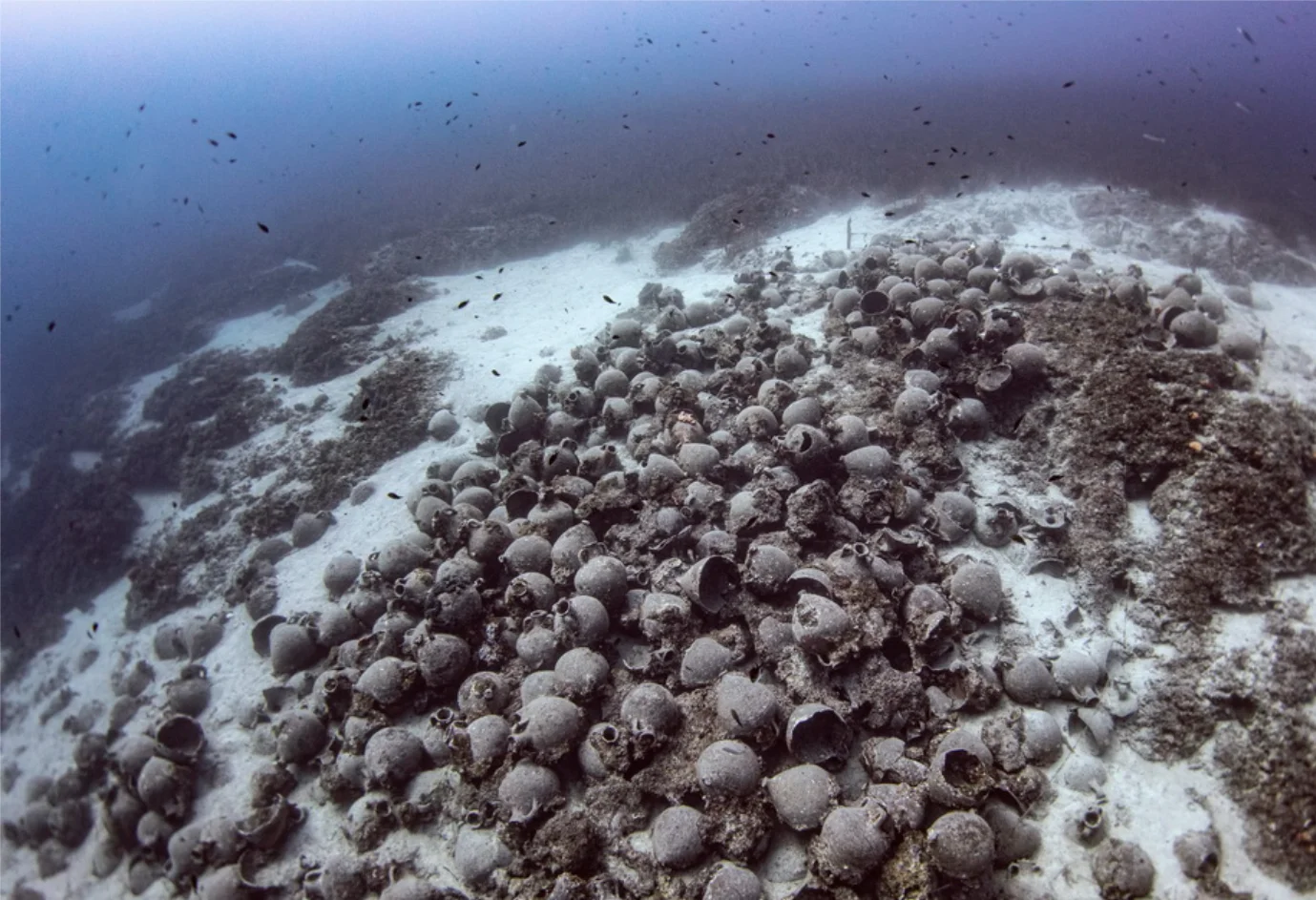 The ship’s main cargo consisted of wine amphorae, which came from Mende in Chalkidiki. Mende was known in antiquity for its excellent quality wine production. The amphorae are scattered on a rocky and sandy bottom, which is covered in places by Posidonia oceanica seagrass.